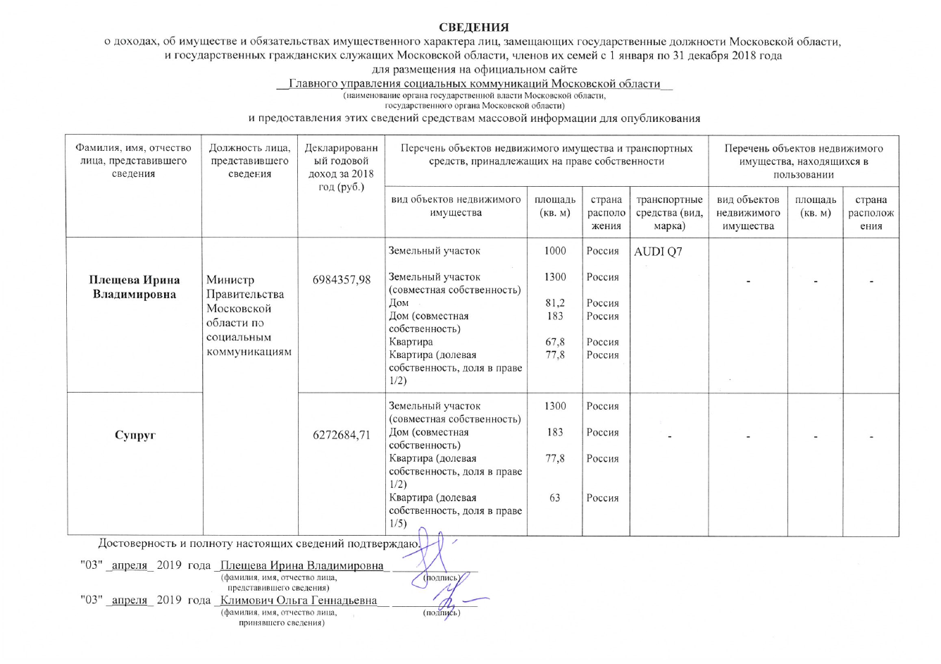 Сведения о доходах, имуществе и обязательствах имущественного характера министра Правительства Московской области по социальным коммуникациям и членов его семьи за период с 1 января 2018 года по 31 декабря 2018 года